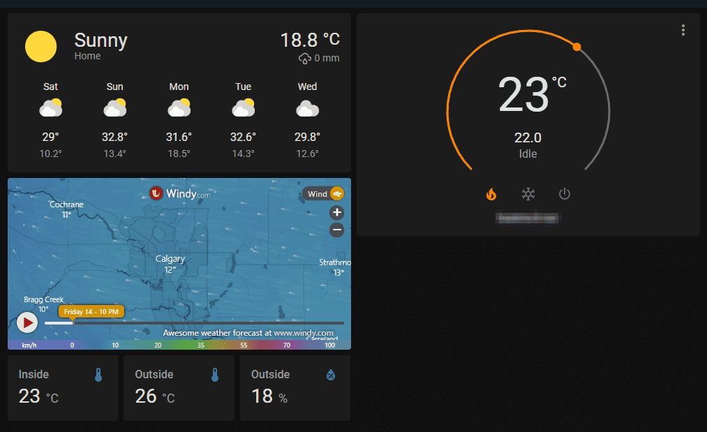 After a few days of stumbling my way around this huge Python project I was able to convert the Honeywell climate platform into a full fledged integration with climate and sensor platforms. With that I can throw together a nice clean looking dashboard: